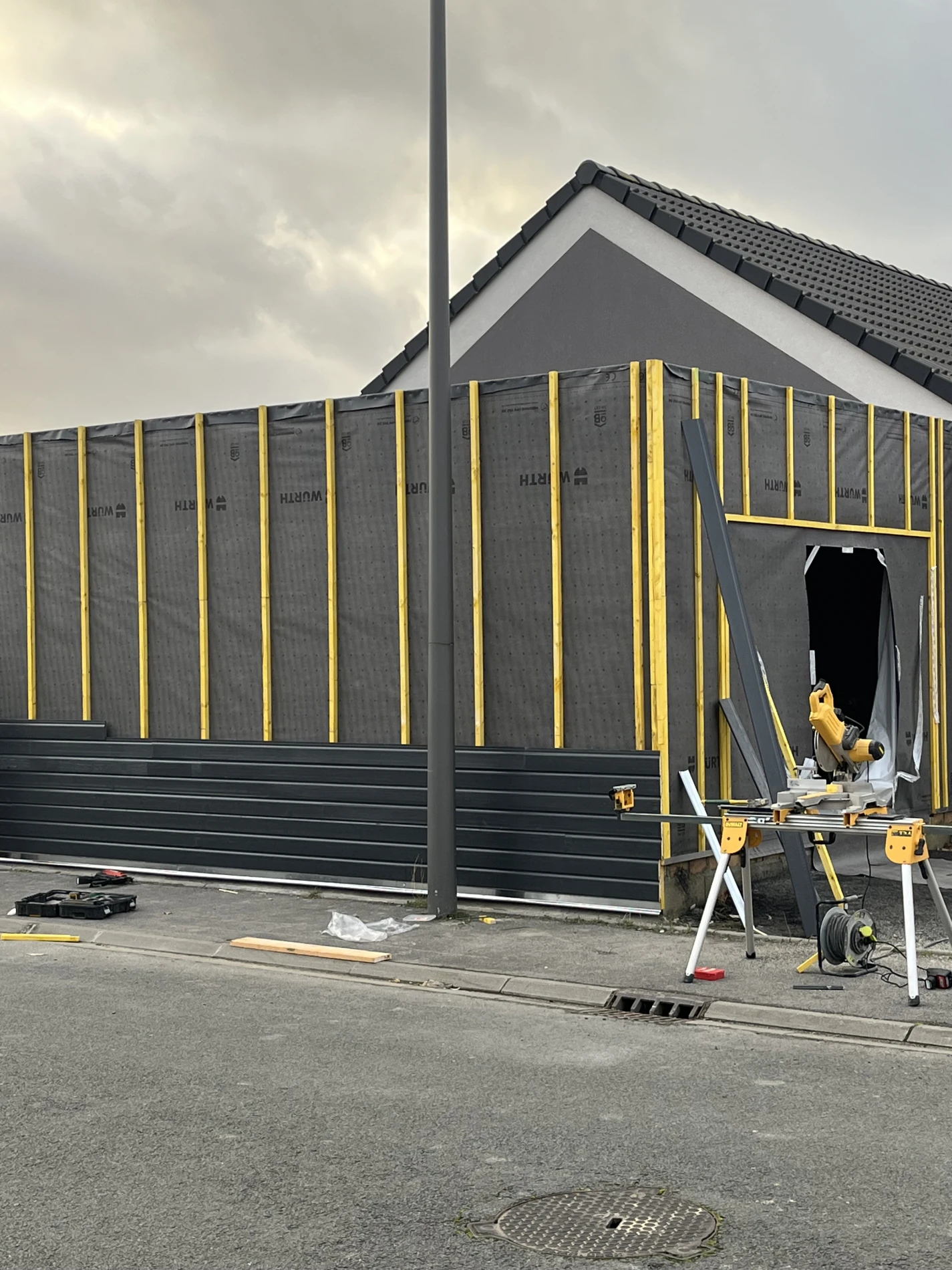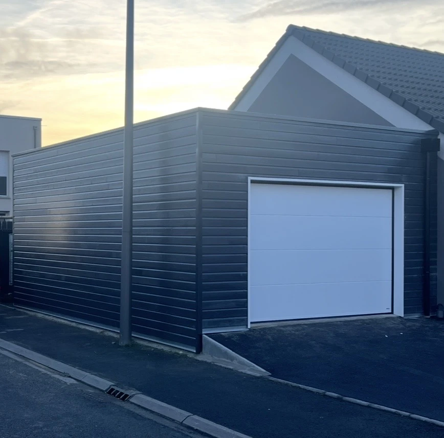 Enfin, les finitions ont été réalisées avec soin, notamment avec la pose d’une porte de garage motorisée et d’une porte d’accès, apportant confort et sécurité. Le chantier s’est conclu par l’installation d’un bardage extérieur Silverwood en teinte gris anthracite, accompagné de profils de finition, conférant à l’ensemble un design moderne et esthétique.