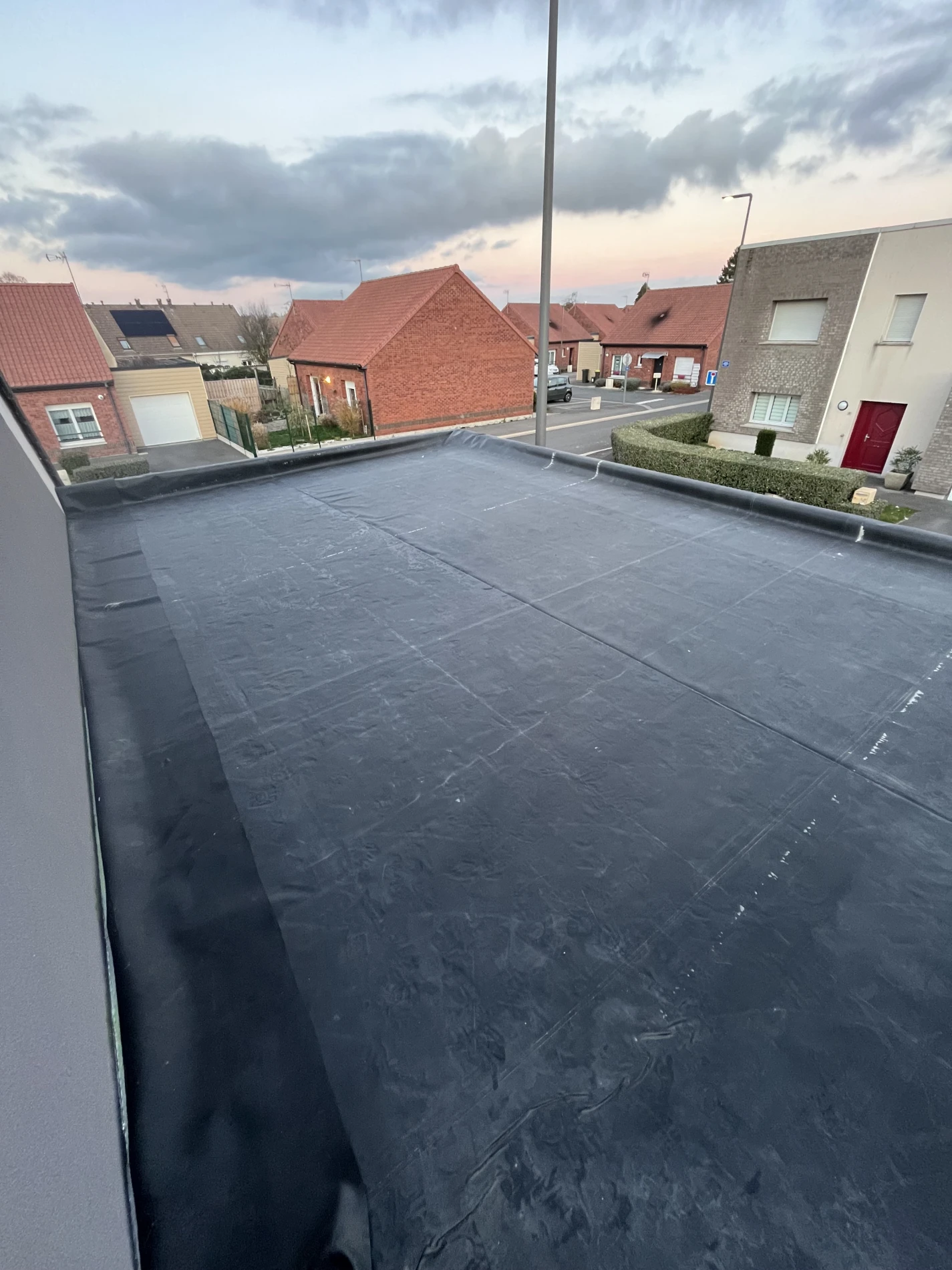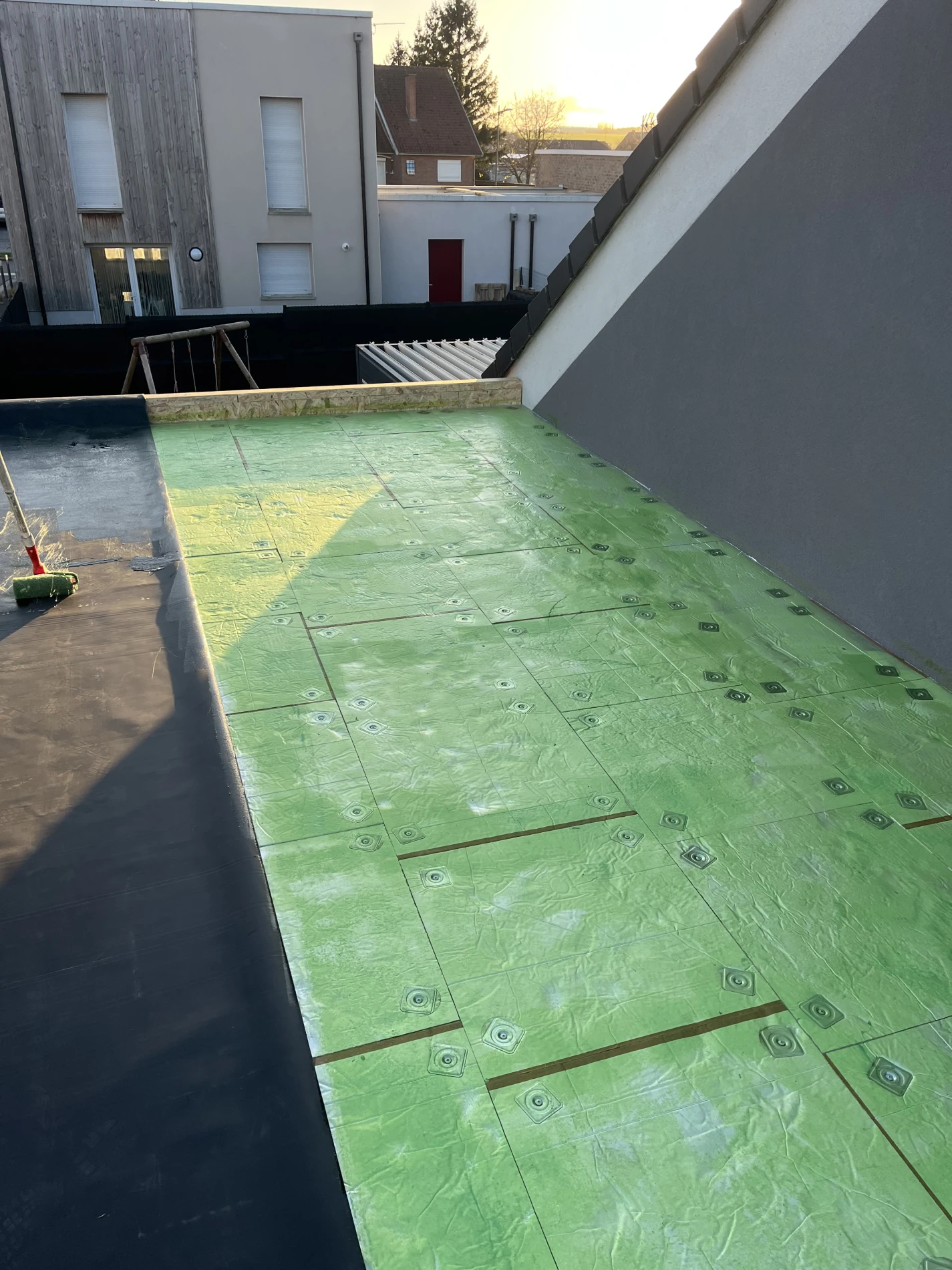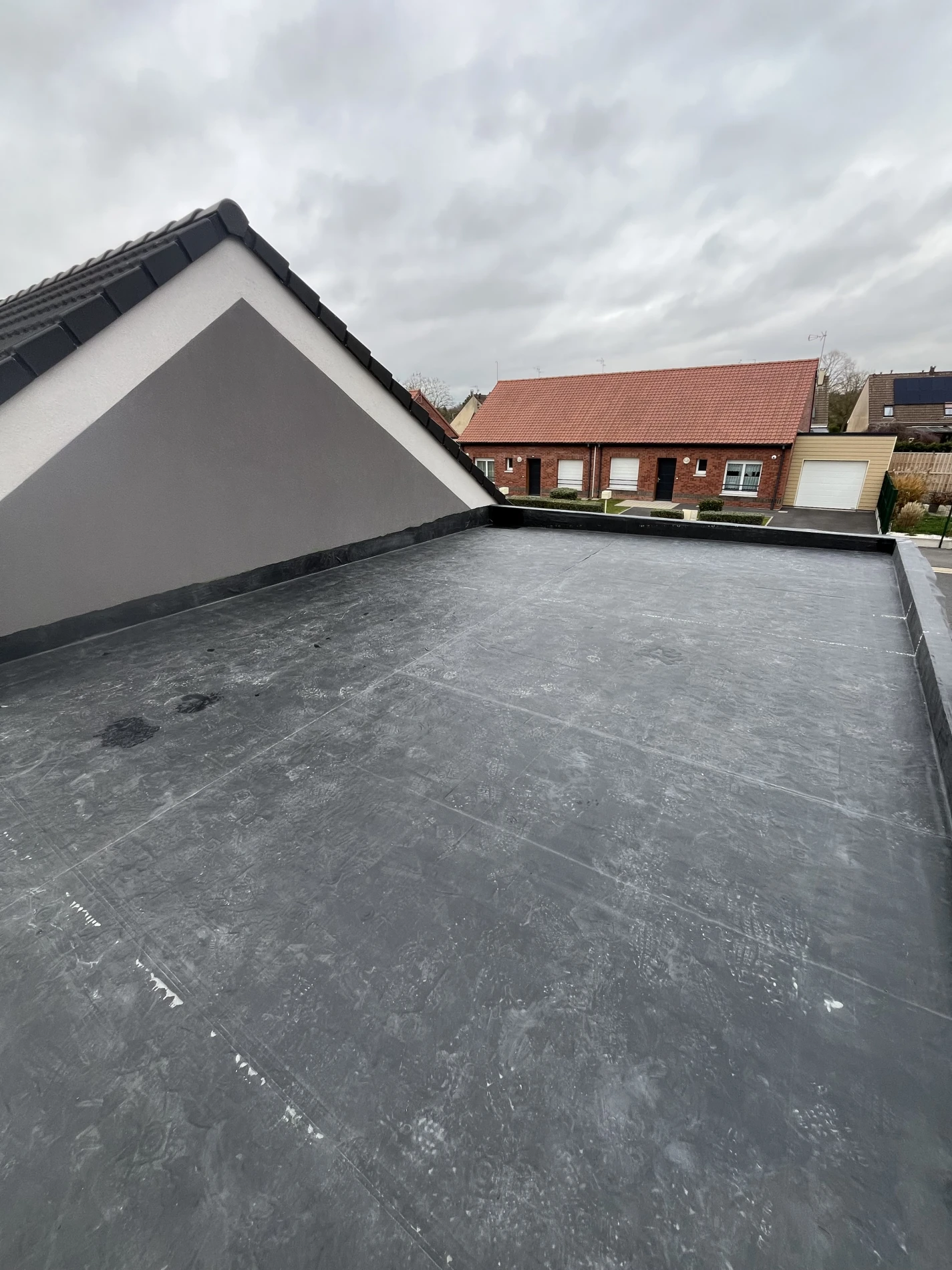 Pour la couverture, une membrane d’étanchéité EPDM Firestone a été installée, offrant une protection durable contre les infiltrations et une excellente résistance aux intempéries. Ce choix de matériau haut de gamme s’inscrit dans une logique de construction durable et performante.